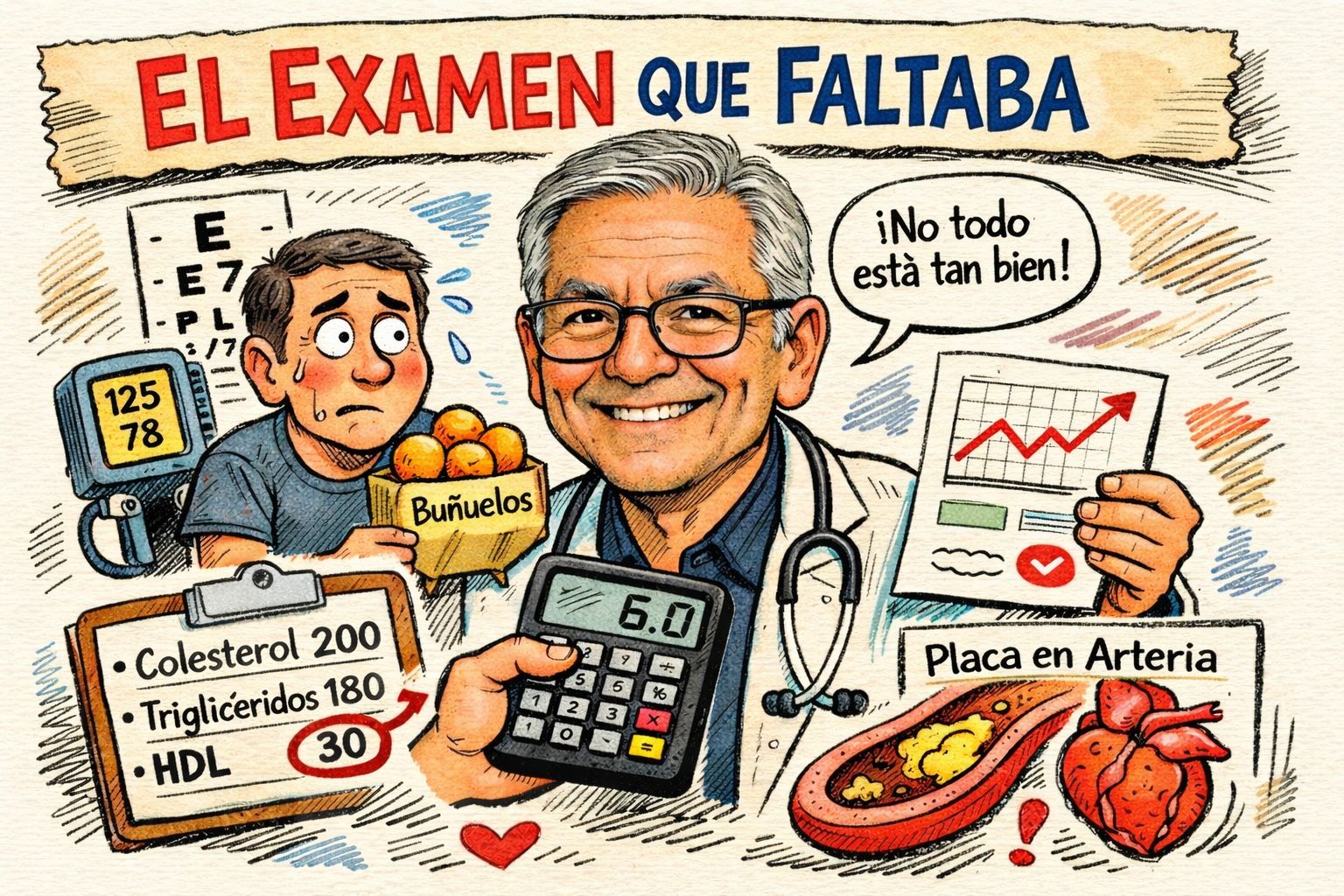 Y claro… empezamos a revisar: glucosa en 99 mg/dL (normal, pero rozando la puerta de la prediabetes), hemoglobina glicosilada en 5,8% (ya tocando la campana de llegada a prediabetes), colesterol total en 200 (aceptable, aunque en el límite), presión arterial 125/78 (normal tirando a alta), no fuma, hace ejercicio… mejor dicho, este paciente podría salir en una revista de “vida saludable edición dominical”.